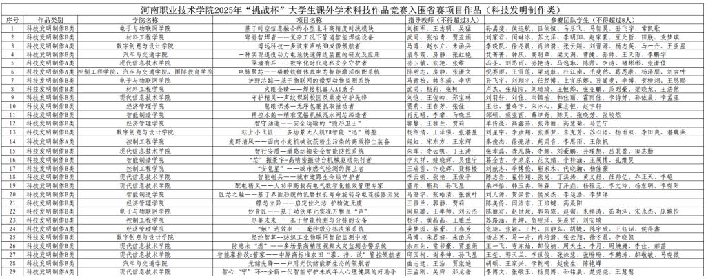 根据《关于举办第十七届“挑战杯”河南省大学生课外学术科技作品竞赛省赛复赛的预通知》文件要求,现将省赛入围名单进行公示。