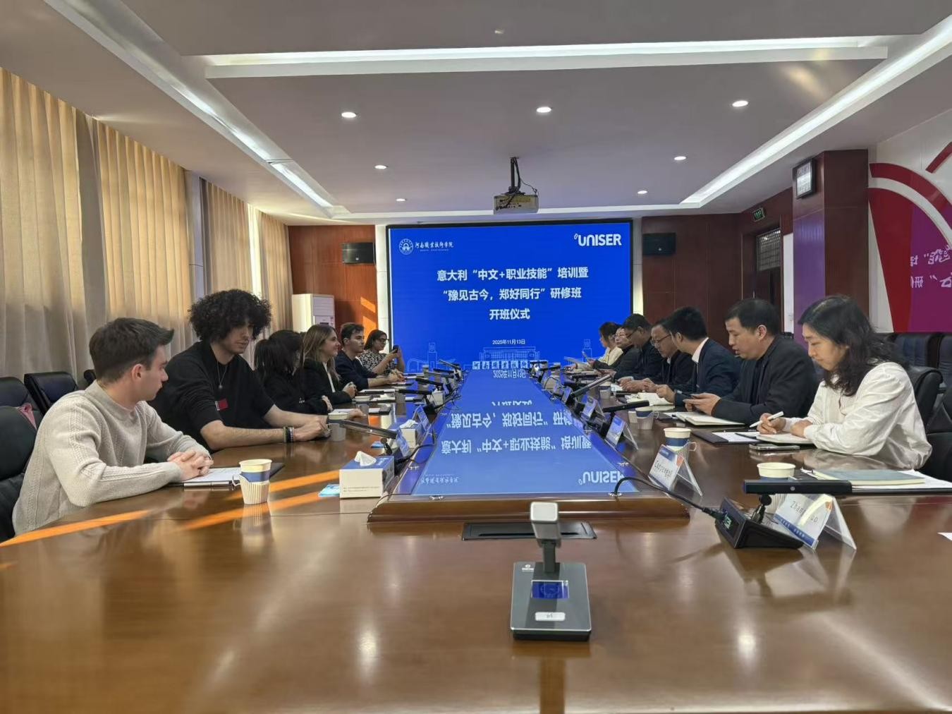 11月13日,河南职院欧洲青年学生“中文+职业技能”培训暨“豫见古今郑好同行”研修项目开班仪式在勤业楼332举行。校党委委员、副校长鲁冬出席并致辞,欧洲人才国际交流中心(UNISER)的带队老师Vittoria Morosi和来自意大利弗洛朗蒂职业教育学院、伦巴第机电一体化产业技术学院等欧洲院校的7名青年学生,以及国际合作交流处、国际教育学院相关负责同志参加开班仪式。开班仪式由国际合作交流处处长王伟主持。