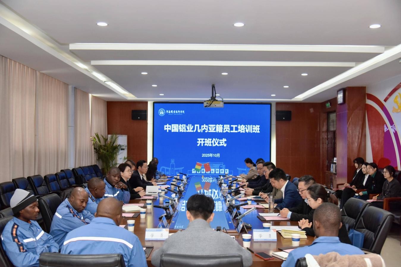 10月21日,河南职业技术学院2025年中国铝业几内亚籍员工培训项目开班仪式在勤业楼332会议室举行。校党委书记厉励作开班致辞,并为学员配发校牌。中国铝业股份有限公司人力资源部副总经理苏明明、有色金属工业人才中心主任助理、教育培训处处长赵丽霞等行业企业嘉宾应邀出席。校党委委员、副校长肖珑出席并向几内亚学员赠送学习礼包,表达美好的祝愿。国际合作交流处、材料工程学院、国际教育学院等相关部门负责同志和授课教师代表以及来自几内亚的全体学员参加仪式。开班仪式由校党委委员、副校长鲁冬主持。