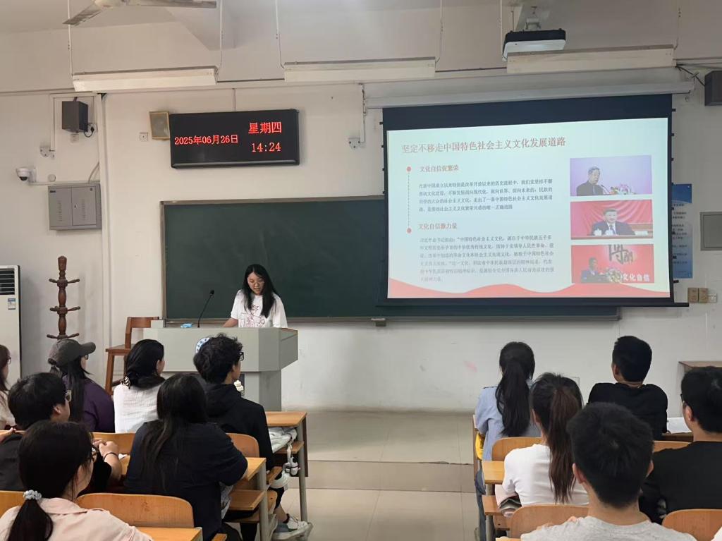 为深入学习贯彻习近平文化思想,引导青年学子深刻领悟中华文化内涵,增强文化自信与时代责任感,6月26日,学校党的创新理论“笃行”学生宣讲团成员李嘉欢面向青马班学员开展了专题宣讲活动,聚焦中华文化传承与发展核心议题,为学员们带来一场思想盛宴。