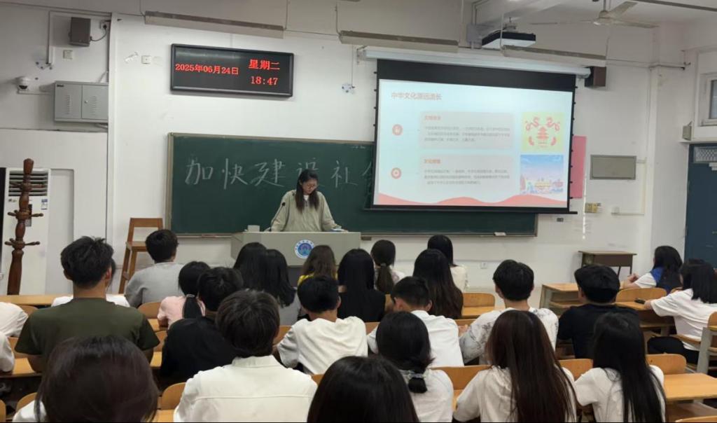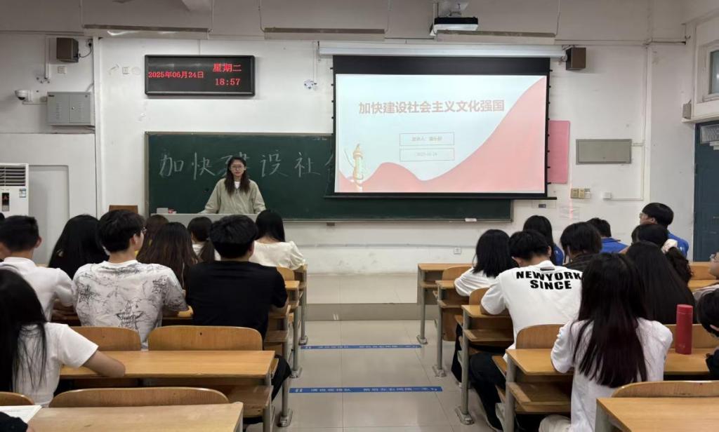 宣讲会上,潘乐彤同学围绕社会主义文化强国建设的重要意义、丰富内涵和实践路径展开阐述。她指出,文化是民族的精神命脉,是国家强盛的重要支撑;加快建设社会主义文化强国,不仅能提升国家文化软实力,还能为实现中华民族伟大复兴提供强大精神动力。她通过生动的案例、详实的数据,向同学们展示了我国在文化建设方面取得的成就,也分析了当前面临的挑战与机遇。同时,潘乐彤同学还结合学生会工作实际,鼓励学生会成员积极开展各类学生活动,利用新媒体讲好中国故事,努力增强同学们的文化自信。