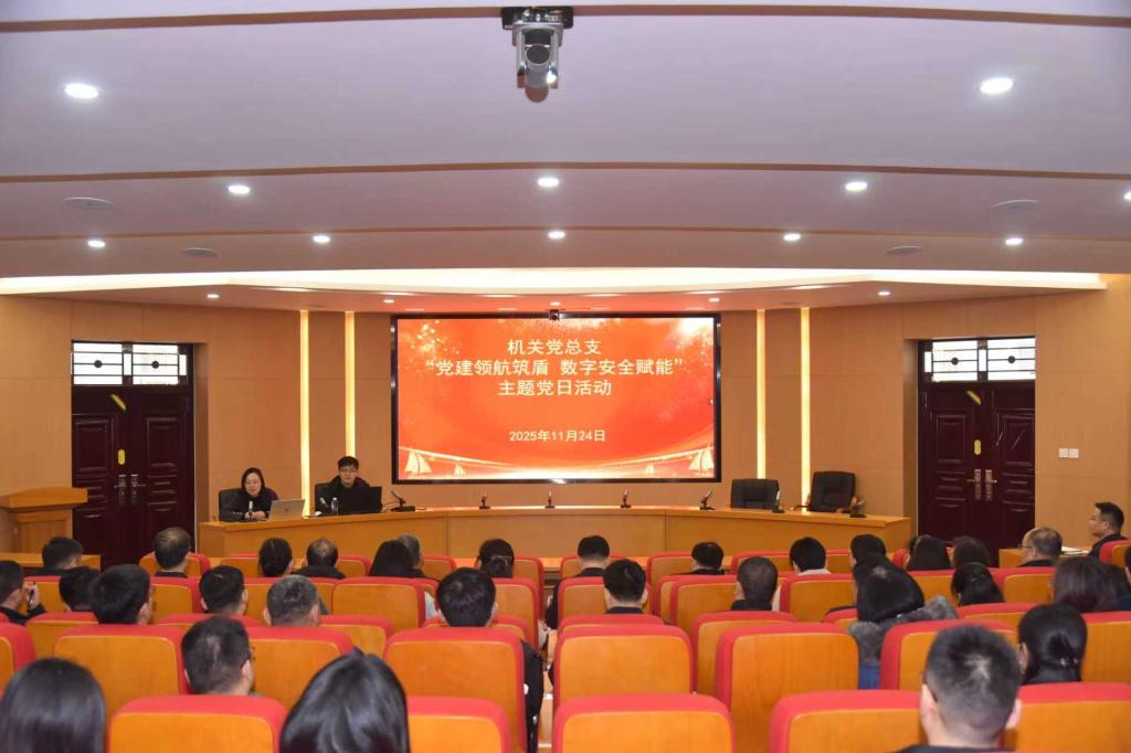 11月24日下午,机关党总支在勤业楼239报告厅开展“党建领航筑盾 数字安全赋能”主题党日活动。机关各支部80余名党员代表参加活动,活动由机关党总支副书记夏连峰主持。